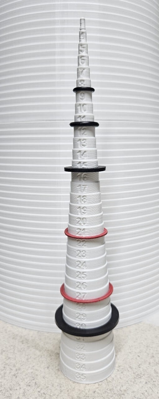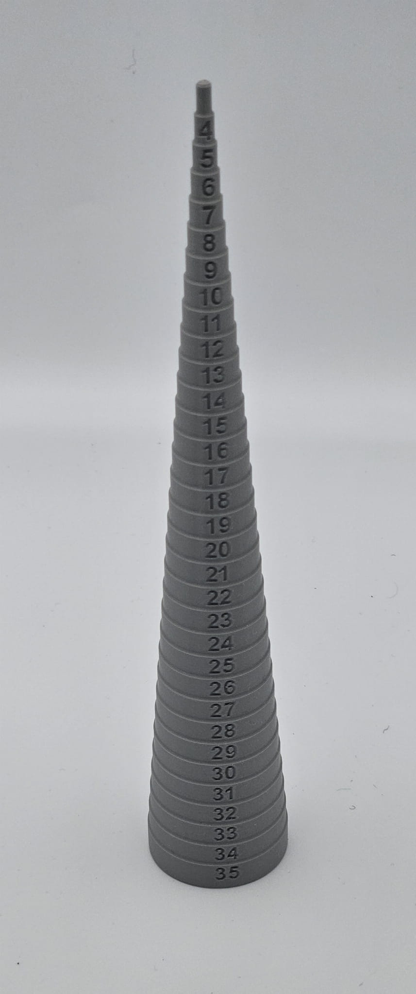 Stożek pomiarowy do O-ringów w rozmiarach 3-35 mm. Na stożku można w szybki sposób sprawdzić średnicę wewnętrzną uszczelki typu O-ring. (wstępna segregacja wymieszanych o-ringów)